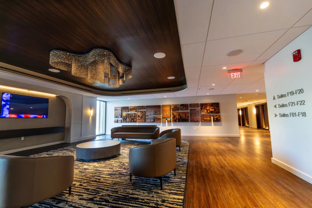 PCI’s total scope included all exterior walls, interior walls on the lower level—including the conference center rooms and stadium concourses—and upper levels 4 & 5, which required premium finishes in the premier suite and lounge areas. Working on upper floors and in many hard-to-reach areas meant safety was a main priority, so crews used PCI’s ‘ladders last’ approach, ensured the usage of proper PPE for all workers and utilized shaft wall configurations on stairwells and elevator shafts to limit fastening in hazardous areas.